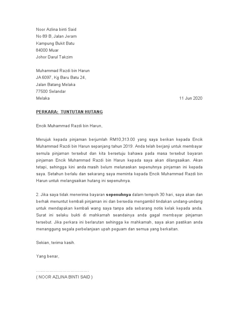 Surat Tuntutan Bayaran Hutang Letter 7saudara Com